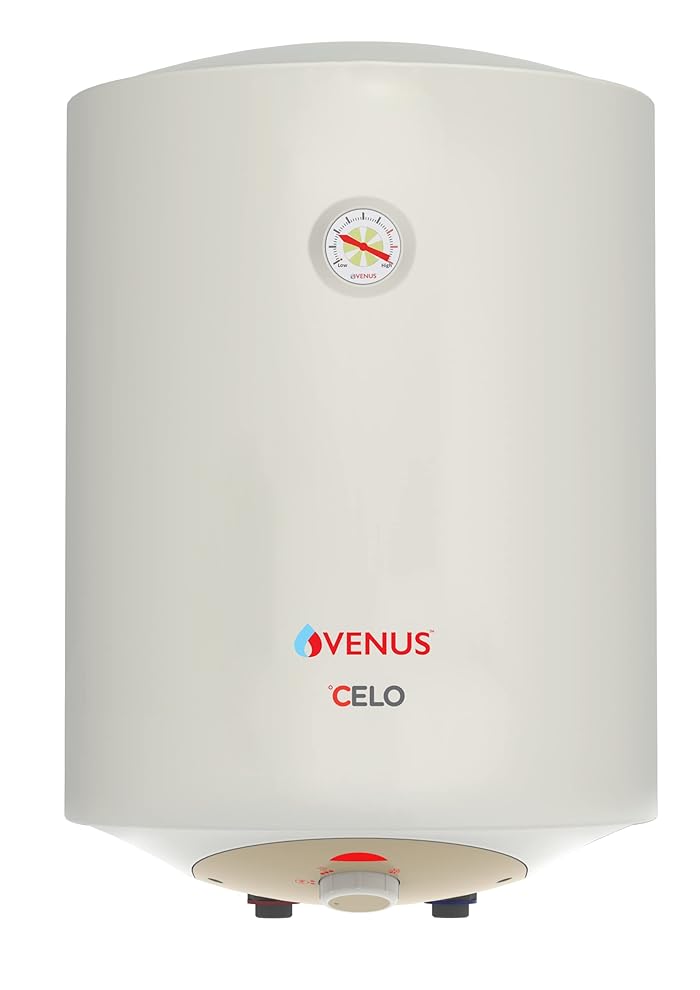 Type: Storage, capacity-15l, wattage - 2000 watts , pressure: 8 bars, bee rating:5 star Inner tank: Porecelain enamel glasslined tank, heating element:Glass lined incoloy 800 element, outer body material: Pre coated ms sheet material Guarantee -7 years on inner tank, 2 years on heating element and 2 years on product Included in the box: 1 storage water heater, flexible hose(2 nos),mfv-1no,user manual-1 no., Screws-2 nos Porcelain enamel glass lined tank: Manufactured in a modern, automated plant using european technology. Protects the tank from rust and corrosion ISI certification: India's first bis approved water heater with porcelain enamelled gl tank 3cm extra thick puf insulation ensures, incoloy 800 element, hard water protection,max safety andsacrificial magnesium anode Product Description Venus Celo Storage Water Heater Celo water heaters is an excellent product that has been designed & built to last. It comes with a durable & corrosion resistant porcelain enamel tank. It is designed to be Hard Water Proof with Scale guard Technology. An updated and pleasing design with metallic finish colours lends this model a new grace & charm to blend with your bathroom decor. Key Features Porcelain Glass lined tank Manufactured in a modern, automated plant using European Technology. Protects the tank from rust and corrosion. PUF insulation 3 cm thick PUF ensures to keeps the water hot for much longer time. Ensures Energy Savings Incoloy 800 Element Withstands temperatures up to 1000C, Long lasting, resists corrosion due to hard water. 8 Bars Pressure Suitable for pressure pumps and multi - storey buildings Temperature Display The display indicates the real-time display of the current temperature. Heat Retention technology No thermal bridge between tank & External housing,thereby reducing thermal losses Sacrificial Magnesium Anode A special device to enhance the corrosion protection of the MG tank by means of “Cathodic action”.